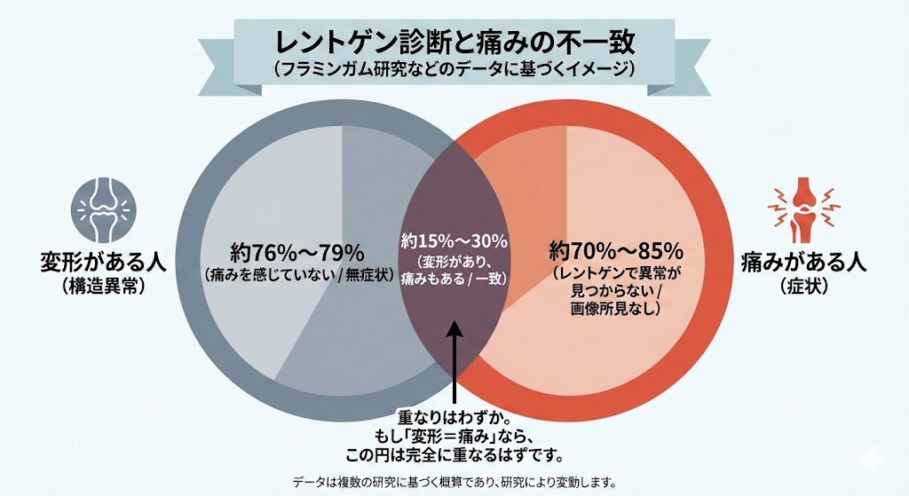 この図を見てください。 「変形がある人(構造異常)」と「痛みがある人(症状)」の円は、少ししか重なっていません。 「変形=痛み」なら、この円は完全に重なるはずです。